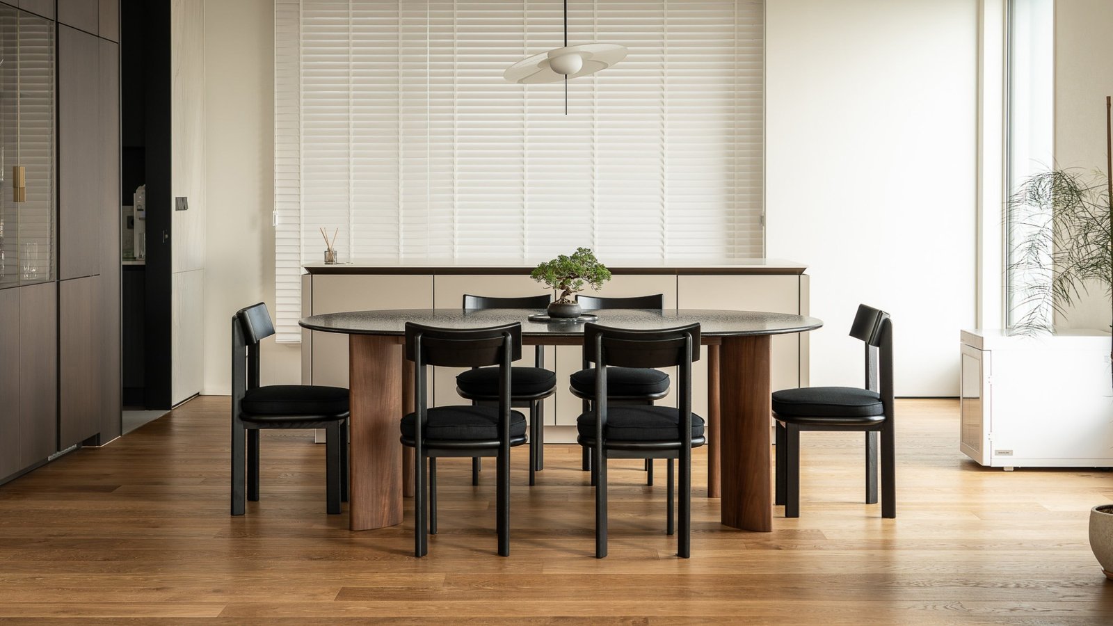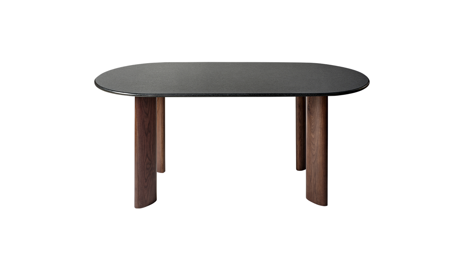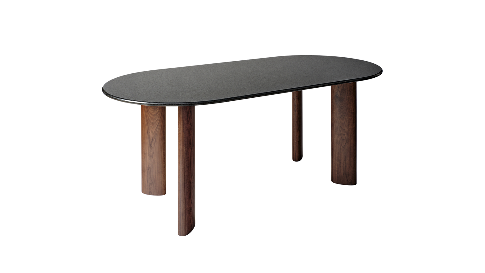 The Oval dining table highlights Eastern Edition’s signature oval base and rounded-edged table top. Simple in its materiality, the black granite contrasts with the natural walnut, making it a timelessly beautiful piece for any dinner occasion.